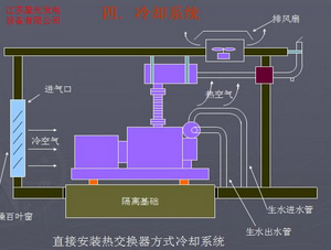 4、機房應有足夠的新風進口.熱風和排煙道應伸出室外,進風口應設置在電機側,排風口設置在水箱側.